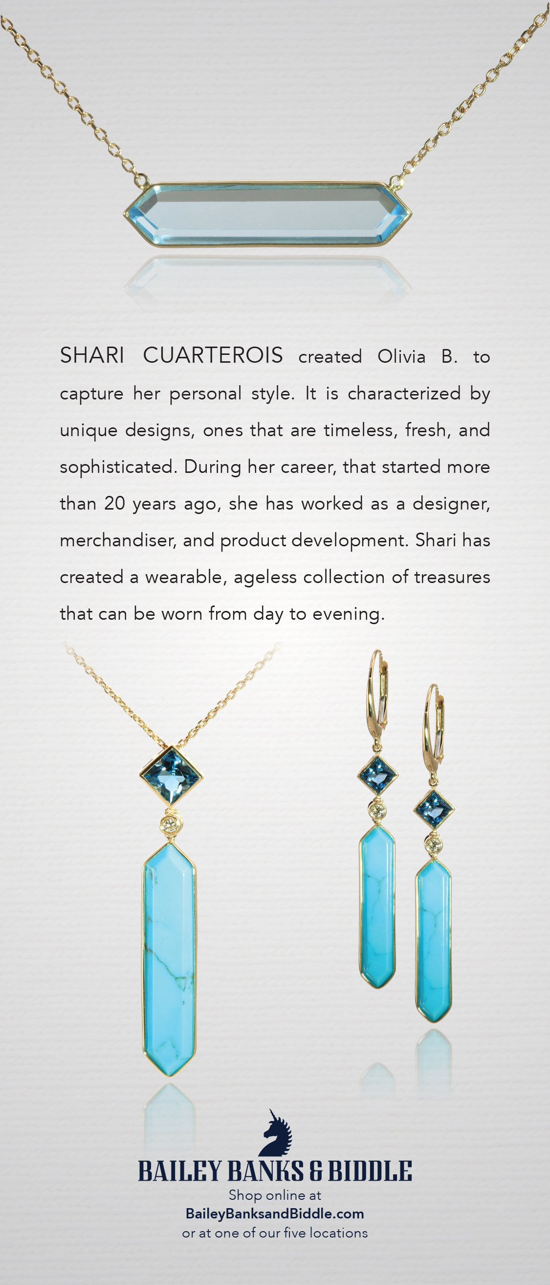 Olivia B is a new jewelry designer with a bespoke collection that contains earrings and necklaces which requires special ordering procedures. The guide shows retail sales associates how to order the pieces as well as shows them examples of currently available pieces. The rack card was designed to introduce Olivia B to Bailey Banks & Biddle guests.